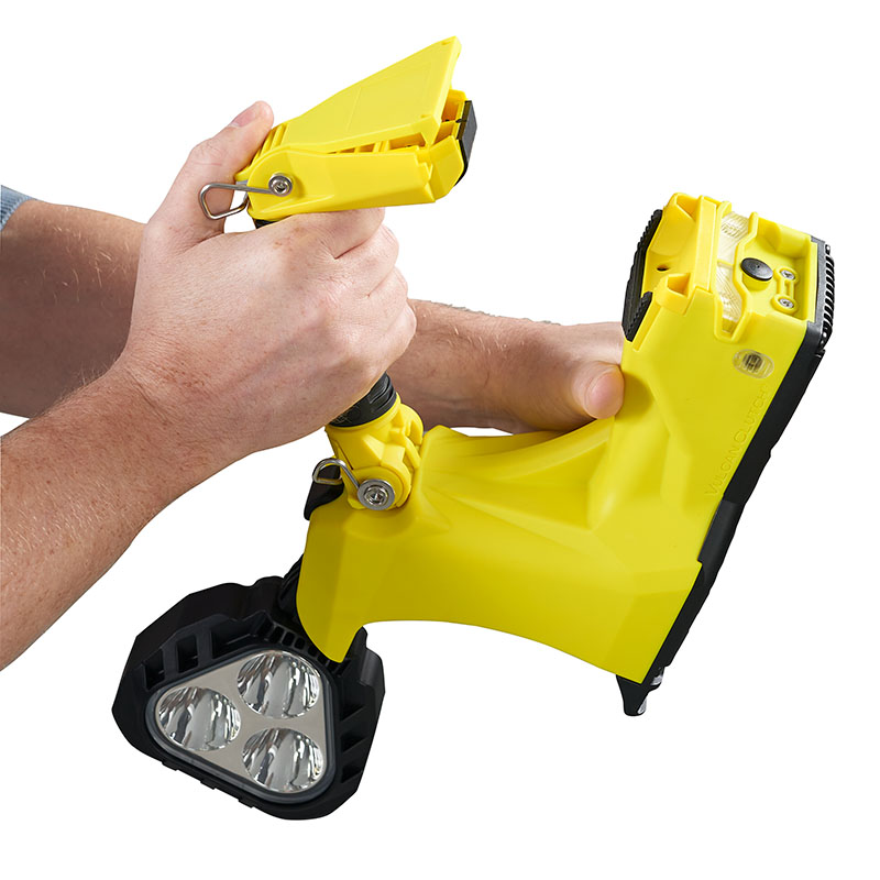Ręczna latarnia Vulcan Clutch® jest wyposażona w unikalny uchwyt zaciskowy, który otwiera się, umożliwiając natychmiastowe użycie bez użycia rąk. Głowa jest wtedy w pełni wyartykułowana w celu bezpośredniego ukierunkowania pracy.
